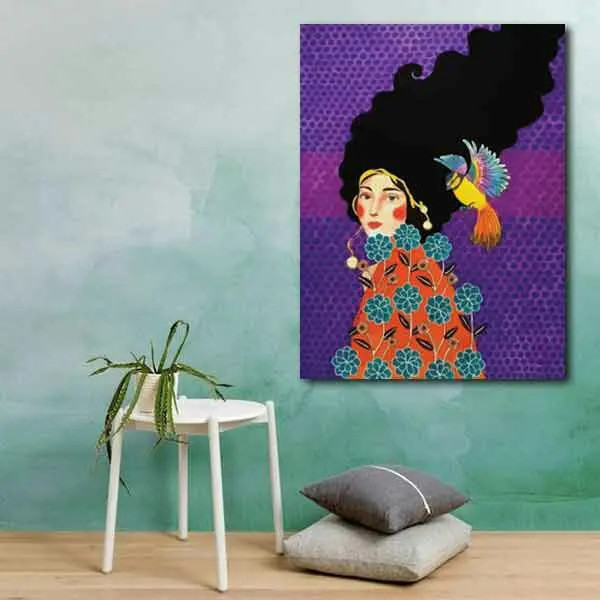 تابلو بوم چاپی لاویا نقاشی ترک طرح زن و پرنده کد ART-1107