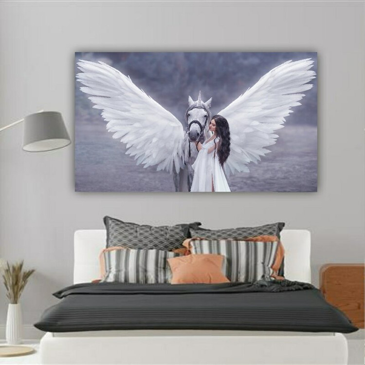 تابلو بوم طرح زن زیبا و اسب تک شاخ